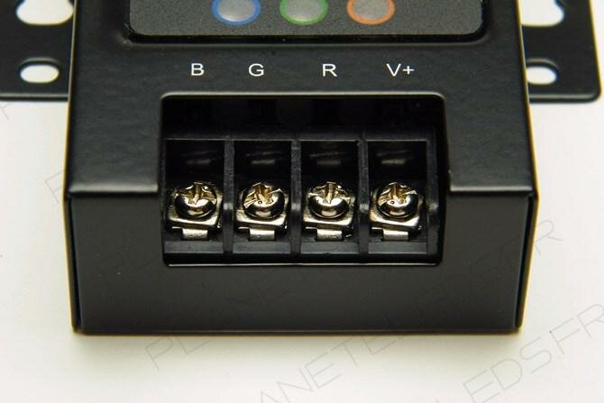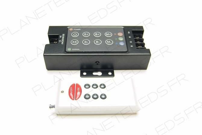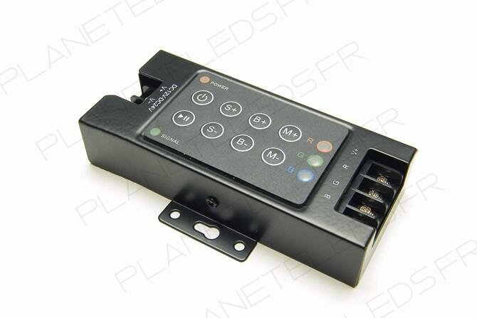 Ce contrôleur RGB vous permettra d'alimenter vos bandes led RGB et d'exploiter les modes de fondu entre les couleurs déjà existant. Il doit être connecté sur une alimentation 60 ou 100W.